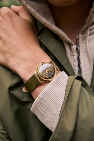 Crafted with a smaller, more modest 34mm stainless-steel case, the Timex x Todd Snyder Dylan Watch is easy to wear. Metallic numeral markers in a class serif font stand beautifully against an olive green or black dial with a sunray finish that gives it a clean, timeless look. The green or black natural leather strap is inspired by the rugged good looks of Todd Snyder's bestselling Dylan Jacket, and will soften and patina over time for a lived-in look and an anytime, anywhere kind of comfort.