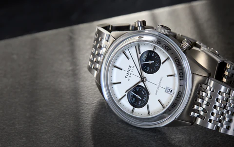 We've also expanded our Marlin Jet offering this season with the addition of a quartz chronograph. If you're not familiar, our Marlin Jet is straight out of the space age, capturing futuristic design ideals of the ‘60s with a domed Hesalite crystal that envelops its bezel. This streamlined design element blurs the lines between case and dial, bringing the Jet’s retro-futuristic appearance to a whole new dimension.