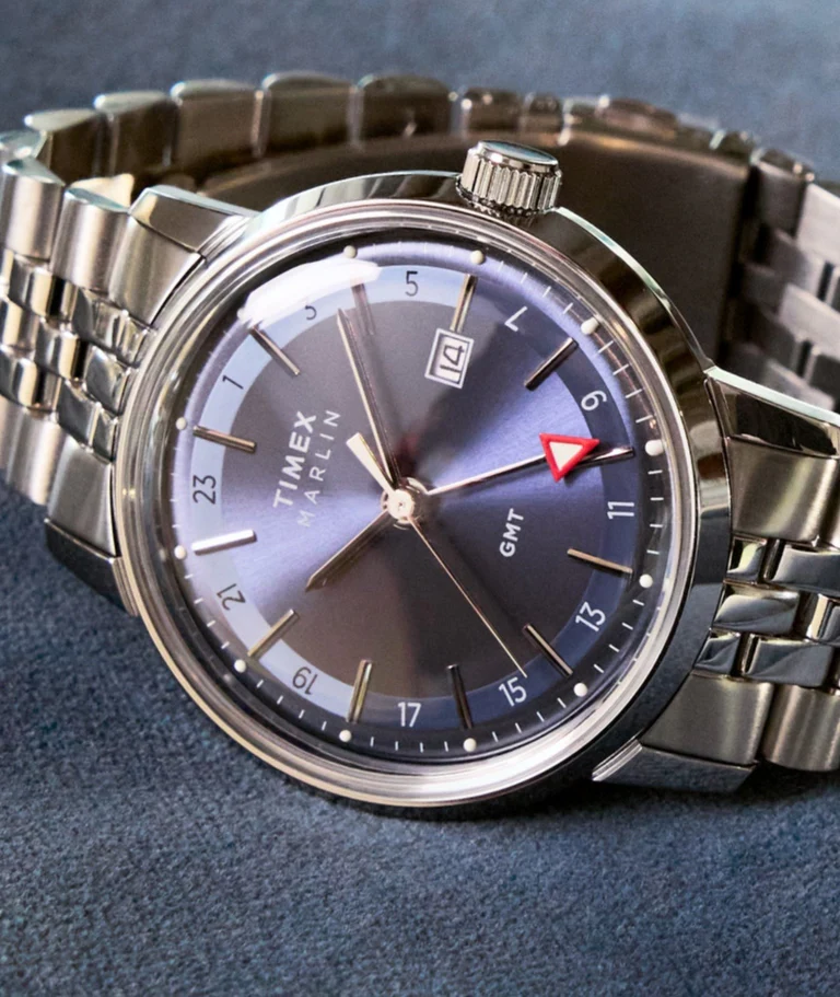 This season, we introduce two new quartz additions to our Marlin line: the Marlin Quartz GMT and the Marlin 3-Hand Quartz. The GMT is capable of tracking two time zones, with a tonal index on its sunray dial for a sophisticated and traditional presentation. It’s housed in a 40mm recycled stainless-steel case with polished finishing and offers either a coordinating brushed and polished stainless-steel bracelet or an eco-friendly natural leather strap.
