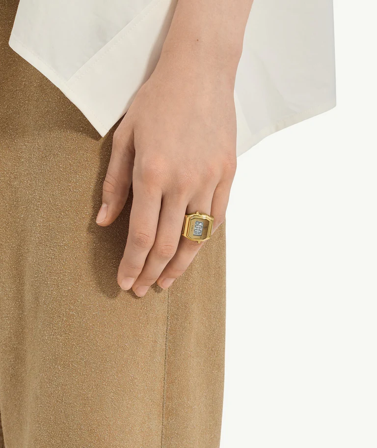 The collection builds on an inspired re-engineering of the iconic Timex T80 digital watch, fusing timekeeping heritage with MM6’s avant-garde perspective. This season, two cult favorites—the T80 Gift Set and the T80 Ring Watch—return in a classic gold-tone finish, a quiet act of radical subversion through material expression.